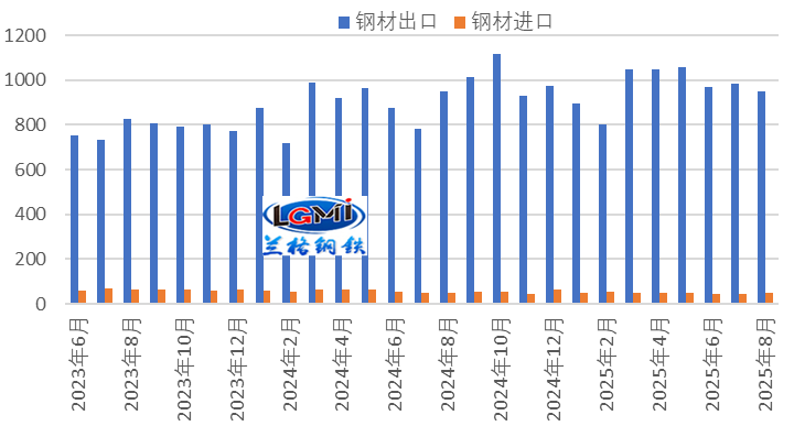 2025年8月我國鋼材月度出口呈現(xiàn)同比微幅增長(zhǎng)態(tài)勢(shì)。據(jù)海關(guān)總署統(tǒng)計(jì)數(shù)據(jù)顯示,出口方面,8月份,我國出口鋼材951.0萬噸,同比增長(zhǎng)0.1%,增幅較上月回落25.5個(gè)百分點(diǎn);1-8月,我國出口鋼材7749.0萬噸,同比增長(zhǎng)10.0%,增幅較上月回落1.4個(gè)百分點(diǎn)。進(jìn)口方面,8月份,我國進(jìn)口鋼材50.0萬噸,同比下降2.0%,降速較上月收窄7.6個(gè)百分點(diǎn);1-8月,我國進(jìn)口鋼材397.7萬噸,同比下降14.1%,降幅較上月收窄1.6個(gè)百分點(diǎn)。