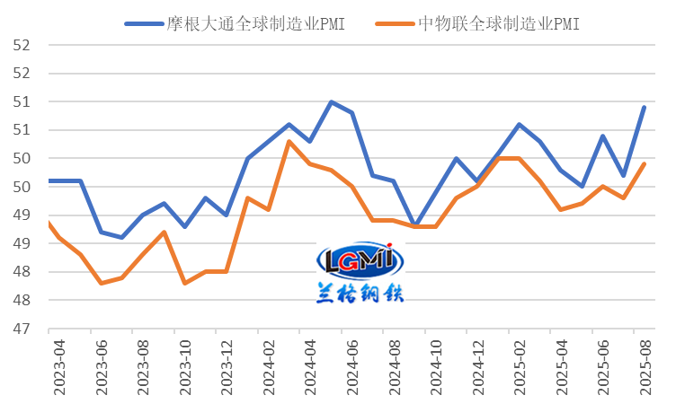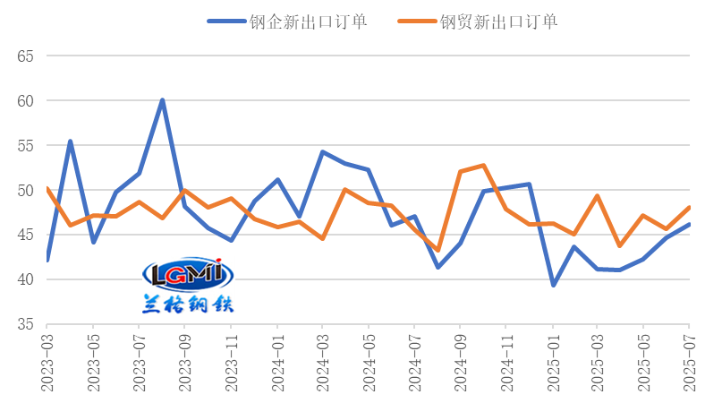 4、我國鋼鐵企業(yè)出口訂單指數(shù)回升至擴(kuò)張區(qū)間從鋼材出口訂單來看,我國鋼鐵企業(yè)出口訂單指數(shù)繼續(xù)回升至擴(kuò)張區(qū)間;中物聯(lián)鋼鐵物流專業(yè)委員會(huì)調(diào)查的2025年8月份鋼鐵企業(yè)新出口訂單指數(shù)為50.4%,較上月回升4.3個(gè)百分點(diǎn)(詳見圖5);中金協(xié)&蘭格鋼鐵網(wǎng)調(diào)研的鋼鐵流通企業(yè)新出口訂單指數(shù)為46.6%,較上月回落1.5個(gè)百分點(diǎn)。鋼鐵企業(yè)出口訂單指數(shù)回升至擴(kuò)張區(qū)間,將對(duì)我國后期鋼材出口有所帶動(dòng)。