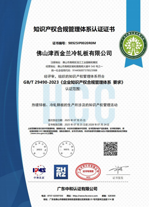 近日,津西金蘭成功通過(guò)《企業(yè)知識(shí)產(chǎn)權(quán)合規(guī)管理體系要求》(GB/T 29490-2023)認(rèn)證并獲得認(rèn)證證書(shū)。這標(biāo)志著津西金蘭在知識(shí)產(chǎn)權(quán)創(chuàng)造、運(yùn)用、保護(hù)及管理領(lǐng)域邁上了規(guī)范化、標(biāo)準(zhǔn)化、系統(tǒng)化的新階段,為公司持續(xù)提升創(chuàng)新能力和核心競(jìng)爭(zhēng)力奠定堅(jiān)實(shí)基礎(chǔ)。