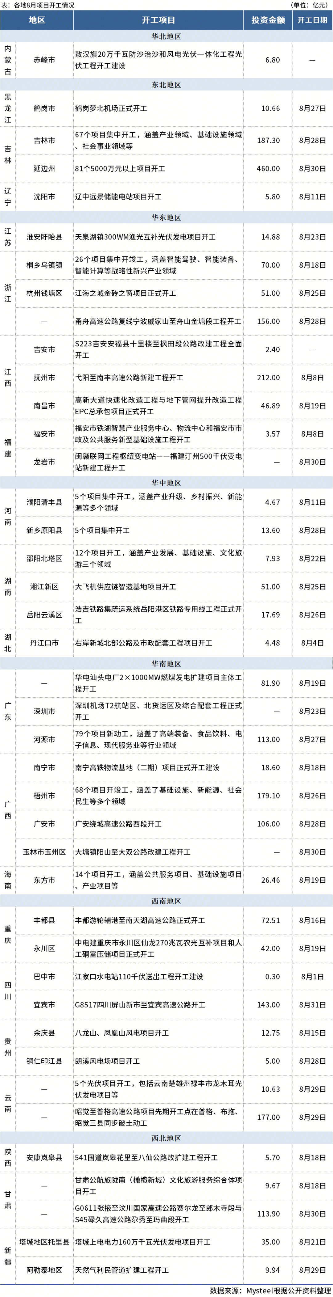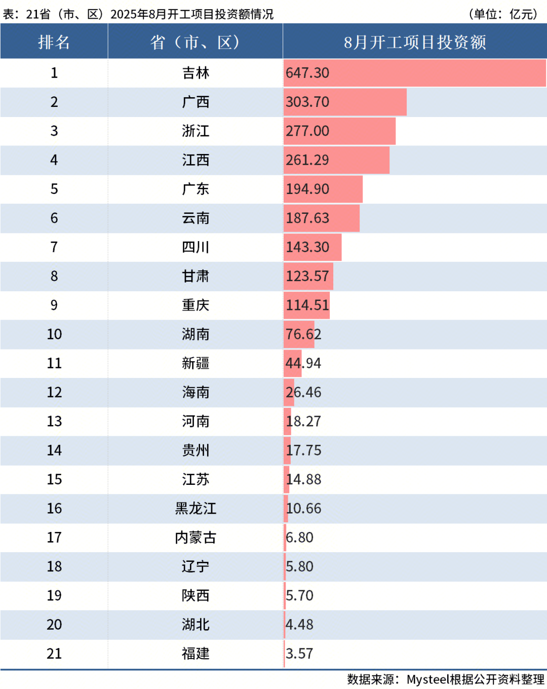 資料顯示,8月,開工投資排名前三的省份為吉林、廣西、浙江,總投資分別為647.3億元、303.7億元、277.0億元。