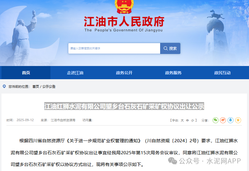 9月12日,四川省江油市人民政府發(fā)布“江油紅獅水泥有限公司望鄉(xiāng)臺石灰石礦采礦權(quán)協(xié)議出讓公示”。