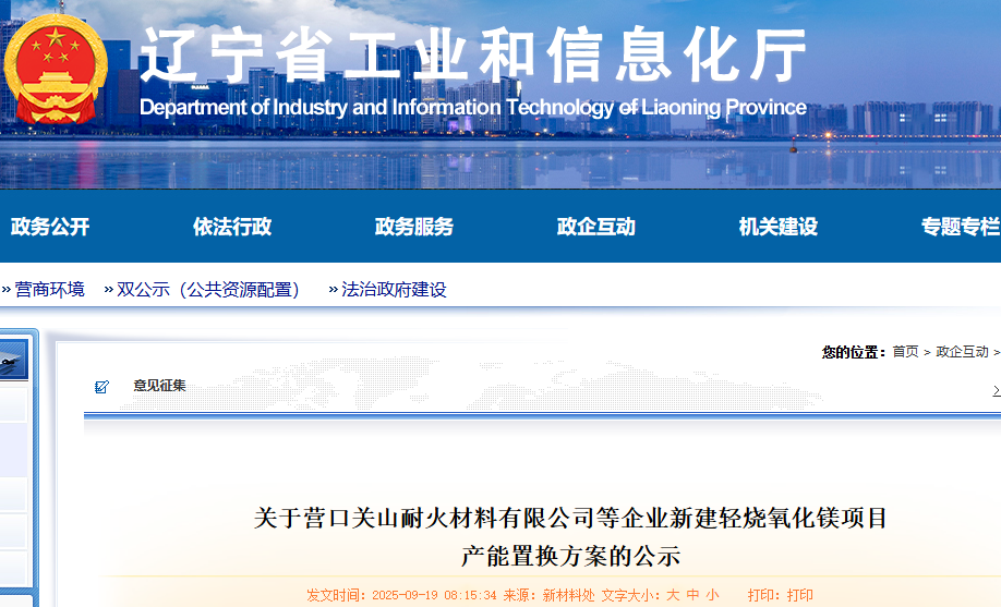 按照《遼寧省人民政府辦公廳關(guān)于推進(jìn)菱鎂行業(yè)高質(zhì)量發(fā)展的實(shí)施意見(jiàn)》(遼政辦發(fā)〔2023〕15號(hào))、《遼寧省菱鎂礦浮選及鎂砂行業(yè)產(chǎn)能置換辦法》(遼工信建材〔2024〕18號(hào))要求,根據(jù)菱鎂行業(yè)專項(xiàng)整治工作進(jìn)展,經(jīng)企業(yè)申請(qǐng)、市工信部門初審、我廳審核,現(xiàn)將營(yíng)口關(guān)山耐火材料有限公司等企業(yè)新建輕燒氧化鎂項(xiàng)目產(chǎn)能置換方案予以公示,公示期10個(gè)工作日。