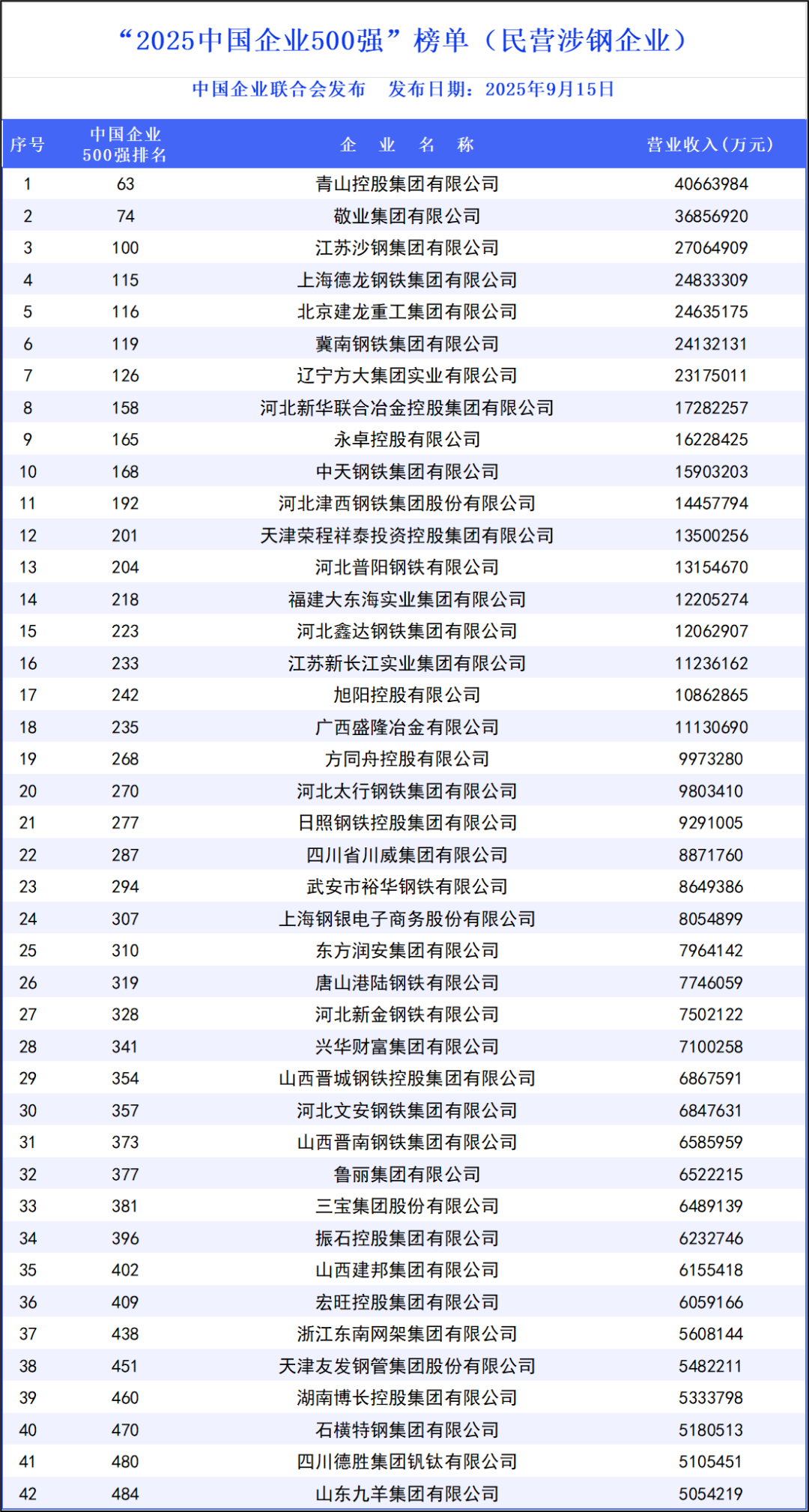 9月15日,中國企業(yè)聯(lián)合會發(fā)布了“2025中國企業(yè)500強(qiáng)”榜單。這是中國企聯(lián)連續(xù)第24次向社會發(fā)布該榜單。其中42家民營涉鋼企業(yè)上榜“2025中國企業(yè)500強(qiáng)”。排在“2025中國企業(yè)500強(qiáng)”前十位的民營鋼鐵企業(yè)有:青山控股集團(tuán)有限公司,敬業(yè)集團(tuán)有限公司,江蘇沙鋼集團(tuán)有限公司,上海德龍鋼鐵集團(tuán)有限公司,北京建龍重工集團(tuán)有限公司,冀南鋼鐵集團(tuán)有限公司,遼寧方大集團(tuán)實業(yè)有限公司,河北新華聯(lián)合冶金控股集團(tuán)有限公司,永卓控股有限公司,中天鋼鐵集團(tuán)有限公司。