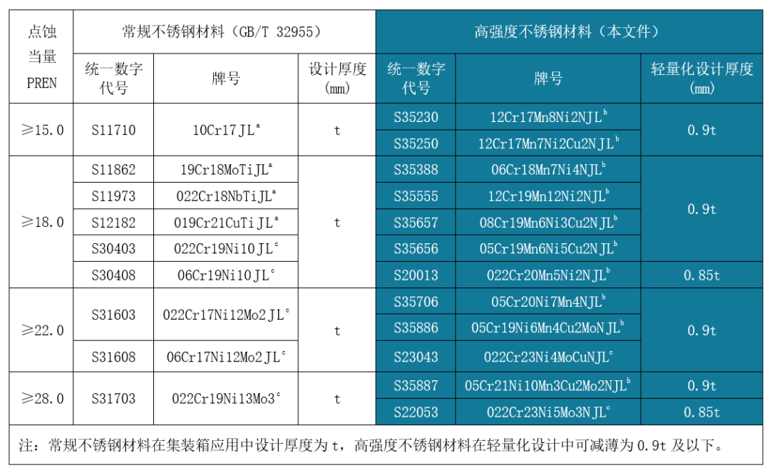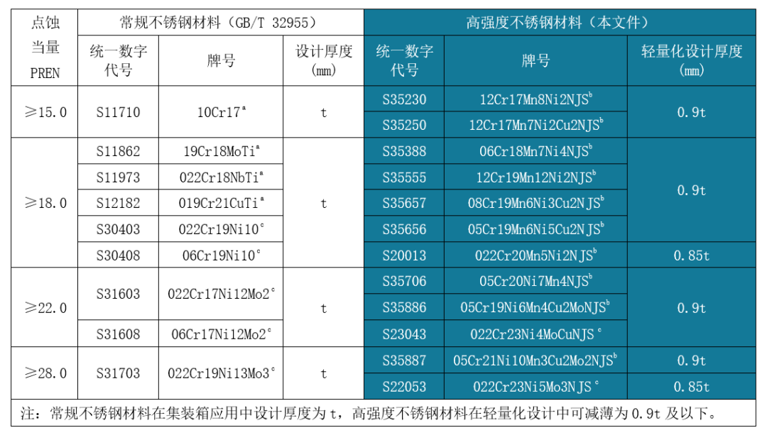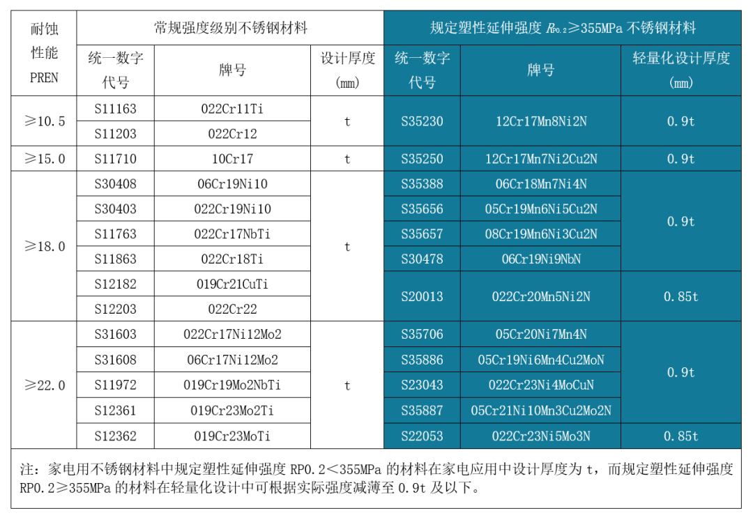 經(jīng)濟型高強度不銹鋼,包括QN系列奧氏體不銹鋼及QD2001雙相不銹鋼在保持良好耐蝕性、焊接性和冷加工性的基礎上顯著提升了強度,可助推集裝箱及家電等領域的產(chǎn)品輕量化設計。新發(fā)布的行業(yè)標準中推薦,高強度不銹鋼相對常規(guī)產(chǎn)品可減薄10%-15%(詳見表1~表3),這對于產(chǎn)業(yè)鏈節(jié)能減排和可持續(xù)綠色發(fā)展具有重要意義。