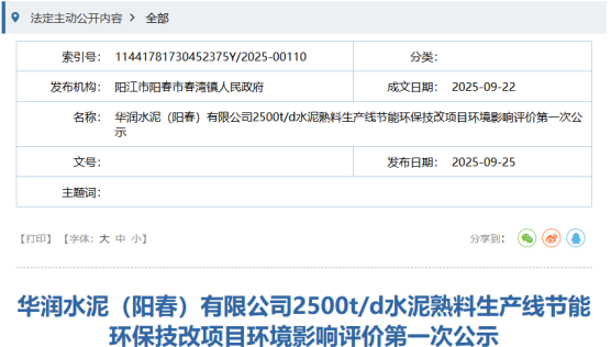 近日,廣東省陽江市陽春市春灣鎮(zhèn)人民政府網(wǎng)站發(fā)布了華潤水泥(陽春)有限公司2500t/d水泥熟料生產(chǎn)線節(jié)能環(huán)保技改項(xiàng)目環(huán)境影響評價(jià)第一次公示。