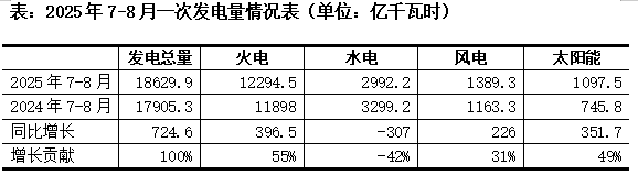 ★新能源替代效應(yīng)大為增強七、八月份,與火電裝機容量基本相當?shù)男履茉闯隽φ敃r,風電、太陽能發(fā)電等新能源裝機的新增發(fā)電量不僅彌補了水電下降帶來的供應(yīng)缺口,還在很大程度上滿足了全社會用電量增長的需求(同比增長3.7%)。這從國家統(tǒng)計局發(fā)布的一次發(fā)電量情況表中可以清楚的看出來。