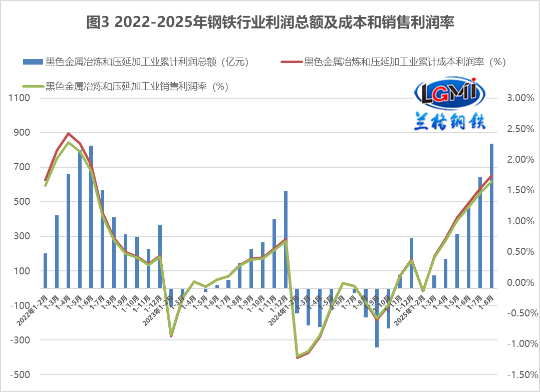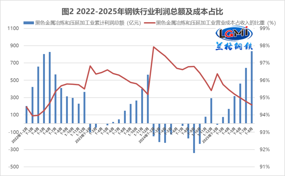 8月份,在經(jīng)濟(jì)運(yùn)行穩(wěn)中有進(jìn)、限產(chǎn)政策逐步落實、淡季效應(yīng)持續(xù)突顯、成本支撐維持韌性的影響下,國內(nèi)鋼鐵市場呈現(xiàn)了震蕩走弱的行情,但由于原料成本持續(xù)下降,使得鋼鐵行業(yè)的盈利空間持續(xù)擴(kuò)大。根據(jù)國家統(tǒng)計局發(fā)布數(shù)據(jù)顯示,2025年1-7月黑色金屬冶煉和壓延加工業(yè)盈利643.6億元,同比增長5175.4%。從月度數(shù)據(jù)來看,1-2月鋼鐵行業(yè)虧損15.5億元,3月份鋼鐵行業(yè)盈利90.6億元,4月份鋼鐵行業(yè)盈利94.1億元,5月份鋼鐵行業(yè)盈利147.7億元,6月份鋼鐵行業(yè)盈利145.9億元,7月份鋼鐵行業(yè)盈利180.8億元,8月份鋼鐵行業(yè)盈利193.4億元,環(huán)比增加12.6億元。