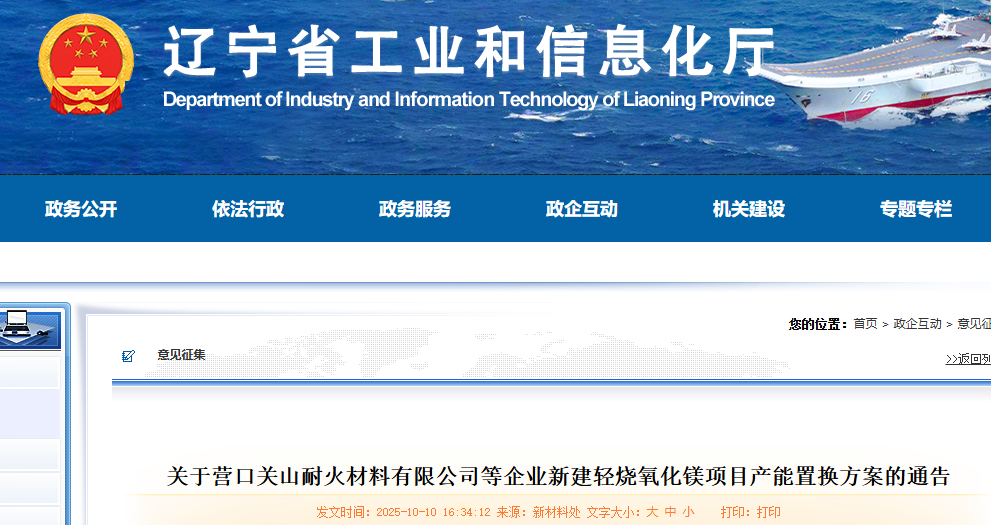 按照《遼寧省人民政府辦公廳關(guān)于推進菱鎂行業(yè)高質(zhì)量發(fā)展的實施意見》(遼政辦發(fā)〔2023〕15號)、《遼寧省菱鎂礦浮選及鎂砂行業(yè)產(chǎn)能置換辦法》(遼工信建材〔2024〕18號)要求,根據(jù)菱鎂行業(yè)專項整治工作進展,經(jīng)企業(yè)申請、市級審核、省級復(fù)核,我廳于2025年9月19日至10月9日,對營口關(guān)山耐火材料有限公司等企業(yè)新建輕燒氧化鎂項目產(chǎn)能置換方案進行了公示,公示期間營口關(guān)山耐火材料有限公司等12家企業(yè)無異議,現(xiàn)予通告。