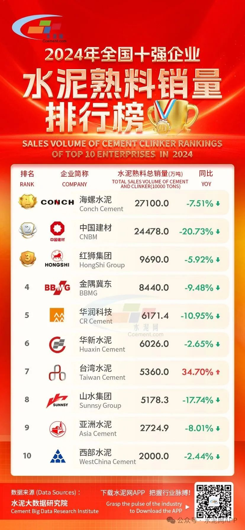 近日,中國(guó)水泥網(wǎng)發(fā)布2024年中國(guó)水泥熟料總銷量TOP10排行榜。從排名來看,2024年海螺水泥熟料總銷量27100萬噸,超越中國(guó)建材位居榜首,華新水泥、臺(tái)灣水泥均超過山水水泥,分別提升至第六位、第七位,山水水泥則下降至第八位,西部水泥進(jìn)入前十位。從銷量變化來看,僅有一家企業(yè)銷量出現(xiàn)增長(zhǎng),九家出現(xiàn)下降。2024年,臺(tái)灣水泥度完成土耳其、葡萄牙相關(guān)資產(chǎn)收購(gòu)后,水泥熟料同比銷量大增34.7%;深度參與海外市場(chǎng)的華新水泥、西部水泥明顯跑贏國(guó)內(nèi)大盤,降幅較小,分別為2.65%、2.44%;中國(guó)建材、山水水泥降幅較大,特別是中國(guó)建材,水泥熟料銷量較同期下降近21%,山水水泥超過17%;華潤(rùn)建材科技降幅在11%左右,金隅冀東、亞洲水泥、海螺水泥、紅獅控股集團(tuán)均低于10%,降幅分別為9.48%、8.01%、7.51%、5.92%。(注:水泥企業(yè)水泥熟料銷量是水泥銷量和熟料外銷量之和(不含自用熟料),既包括企業(yè)在國(guó)內(nèi)的銷量也包括在海外的銷量;天瑞水泥暫未披露2024年度年報(bào),不參與此次排名)