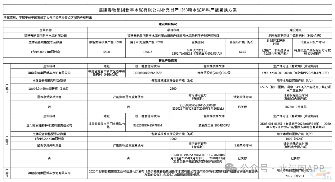 變更后為福建春馳新豐水泥一條5500t/d熟料生產線補充產能1856.2t/d,補充后產能為6753t/d,退出產能來自該企業(yè)一條2500t/d及玉門老君廟特種水泥一條1000t/d熟料生產線。
