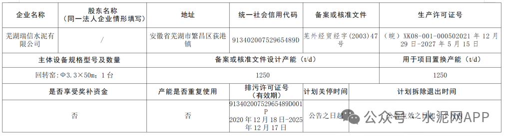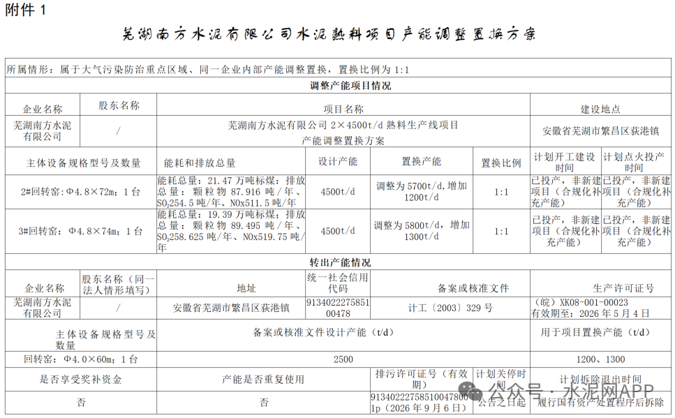 根據(jù)《水泥玻璃行業(yè)產(chǎn)能置換實施辦法(2024年本)》等文件要求,蕪湖南方水泥有限公司將2#、3#水泥熟料生產(chǎn)線(產(chǎn)能均為4500t/d)通過補產(chǎn)能方式分別增加到5700t/d、5800t/d,置換產(chǎn)能來自本企業(yè)1#水泥熟料生產(chǎn)線(產(chǎn)能為2500t/d),產(chǎn)能調(diào)整置換比例為1:1。安徽海螺水泥股份有限公司白馬山水泥廠擬將1條4000t/d水泥熟料生產(chǎn)線通過補產(chǎn)能方式增加到5250t/d,置換產(chǎn)能來自蕪湖市華楊水泥有限責(zé)任公司(產(chǎn)能1250t/d)、蕪湖瑞信水泥有限公司(產(chǎn)能1250t/d),置換比例為2:1。