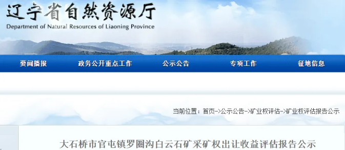 大石橋市官屯鎮(zhèn)羅圈溝白云石礦采礦權(quán)出讓收益評(píng)估報(bào)告通過遼寧省自然資源廳門戶網(wǎng)站向社會(huì)公示,公示10個(gè)工作日。如有異議,請(qǐng)于公示之日起10個(gè)工作日內(nèi)以電話方式先向省自然資源廳礦產(chǎn)資源保護(hù)監(jiān)督處提出簡(jiǎn)要意見,隨后及時(shí)將書面意見反饋到省自然資源廳礦產(chǎn)資源保護(hù)監(jiān)督處。