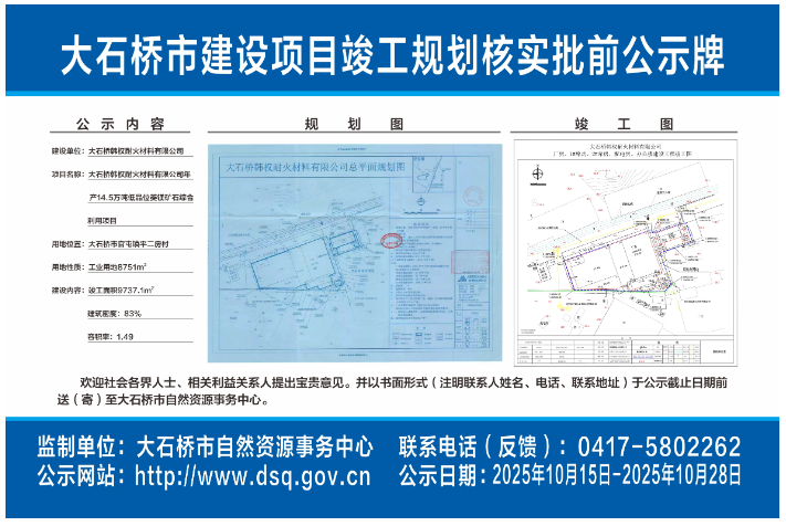 大石橋韓權(quán)耐火材料有限公司年產(chǎn)14.5萬噸低品位菱鎂礦石綜合利用建設(shè)項目,核發(fā)《建設(shè)工程規(guī)劃核實通知書》批前公示