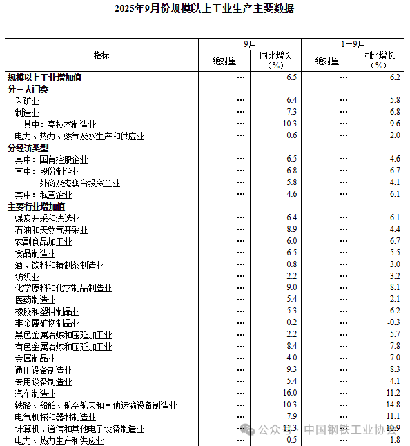 分三大門類看,9月份,采礦業(yè)增加值同比增長6.4%,制造業(yè)增長7.3%,電力、熱力、燃氣及水生產(chǎn)和供應業(yè)增長0.6%。