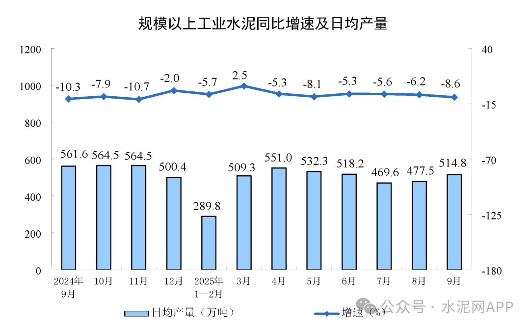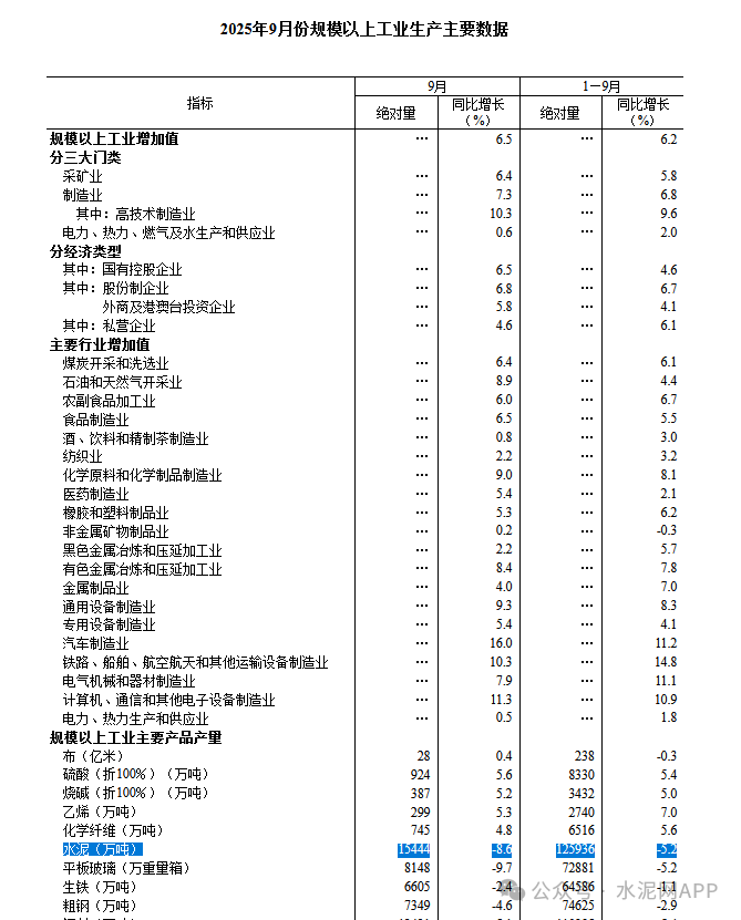 據(jù)國家統(tǒng)計局?jǐn)?shù)據(jù),9月份,規(guī)模以上工業(yè)增加值同比實際增長6.5%(增加值增速均為扣除價格因素的實際增長率)。從環(huán)比看,9月份,規(guī)模以上工業(yè)增加值比上月增長0.64%。1—9月份,規(guī)模以上工業(yè)增加值同比增長6.2%。其中水泥行業(yè)9月份產(chǎn)量15444萬噸,同比下降8.6%,1-9月全國水泥產(chǎn)量125936萬噸,同比下降5.2%。此外,數(shù)據(jù)顯示,2024年1-9月全國水泥產(chǎn)量為132670萬噸,由此計算,今年1-9月水泥全口徑產(chǎn)量比去年同期減少6734萬噸,降幅5.08%。