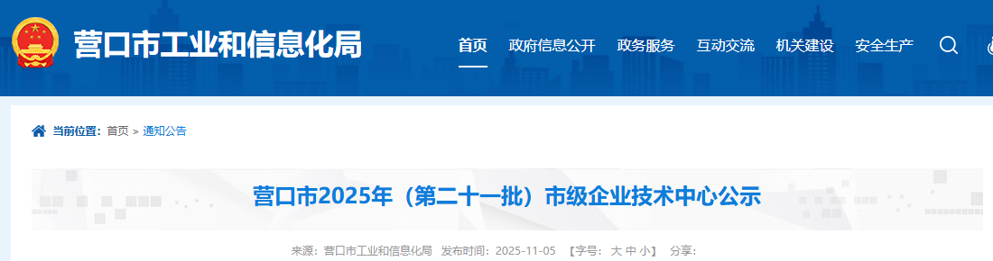 現(xiàn)將擬認定的2025年(第二十一批)營口市市級企業(yè)技術中心名單(附件)予以公示,公示期為11月5日-11月11日,如有意見,請將意見以書面(實名)形式,反饋營口市工業(yè)和信息化局科學技術科。