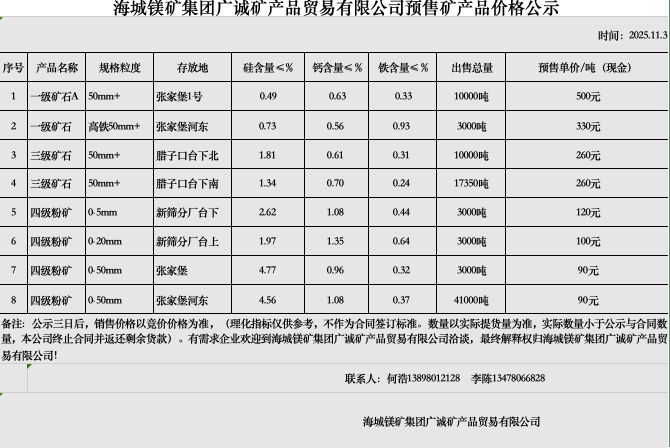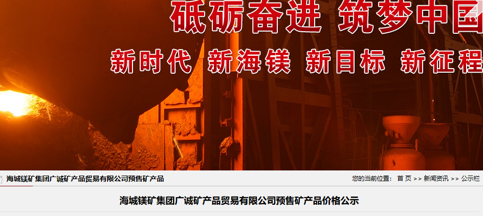 海城鎂礦集團廣誠礦產(chǎn)品貿(mào)易有限公司預售礦產(chǎn)品價格公示