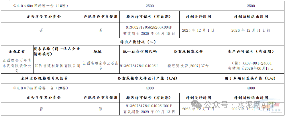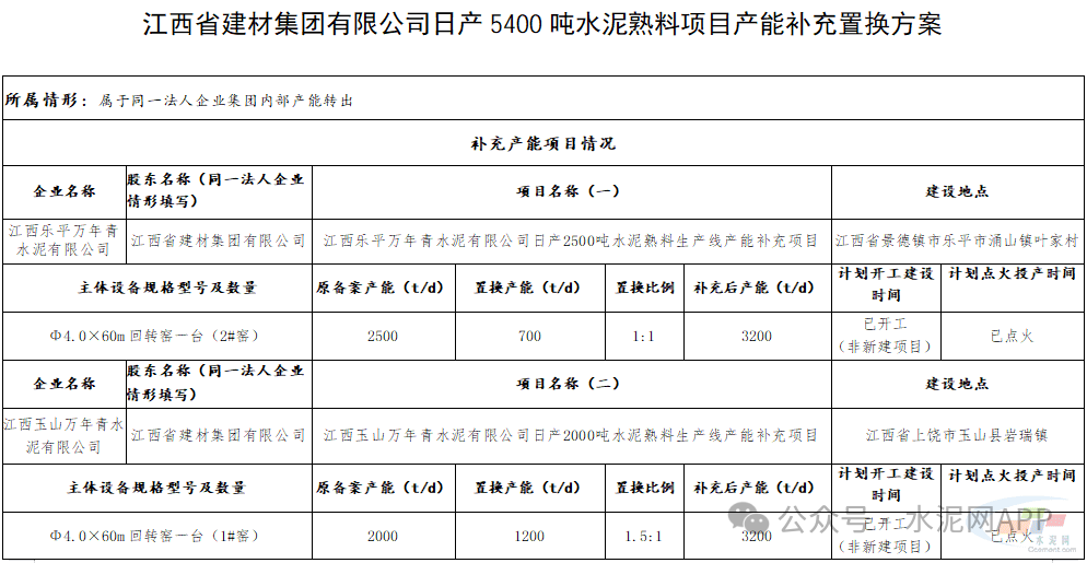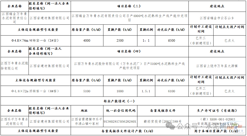 公示內容顯示,江西省建材集團有限公司擬將下屬成員企業(yè)江西樂平萬年青水泥有限公司1#窯2500t/d水泥熟料產能,用于江西樂平萬年青水泥有限公司、江西玉山萬年青水泥有限公司兩家企業(yè)2條水泥熟料生產線進行補充產能,置換比例分別為1︰1和1.5︰1,分別補充江西樂平萬年青水泥有限公司2#窯700t/d水泥熟料產能、江西玉山萬年青水泥有限公司1#窯1200t/d水泥熟料產能;