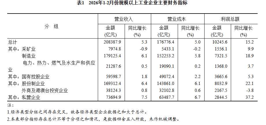 1—2月份,全國(guó)規(guī)模以上工業(yè)企業(yè)實(shí)現(xiàn)利潤(rùn)總額10245.6億元,同比增長(zhǎng)15.2%(按可比口徑計(jì)算,詳見附注二)。
