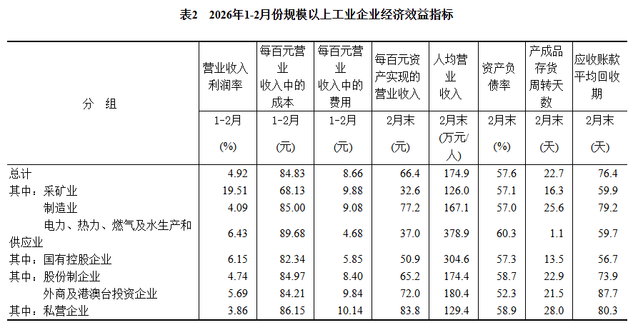 1—2月份,規(guī)模以上工業(yè)企業(yè)每百元營(yíng)業(yè)收入中的成本為84.83元,同比減少0.24元;每百元營(yíng)業(yè)收入中的費(fèi)用為8.66元,同比增加0.02元。