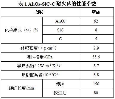 福山區(qū)2#煉鋼廠的鐵水包主要承接高爐鐵水,并通過機(jī)械攪拌脫硫后,轉(zhuǎn)移到煉鋼轉(zhuǎn)爐進(jìn)行冶煉。鐵水包上部空置區(qū)域的包璧不與鐵水直接接觸,僅遭受鐵水熱輻射作用,通常采用氧化鋁質(zhì)耐火材料,渣線及下部區(qū)域與包底遭受侵蝕較嚴(yán)重,主要采用Al2O3-SiC-C耐火磚,性能見表1。鐵水包損毀主要是由工作襯剝落(包括熱剝落、結(jié)構(gòu)剝落及機(jī)械剝落)導(dǎo)致的,其中剝落嚴(yán)重的部位在工作襯側(cè)壁,反復(fù)的熱膨脹導(dǎo)致耐火磚出現(xiàn)裂紋,引起襯磚的脫落,常需要進(jìn)行修補(bǔ)。
