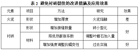 通過分析襯磚損毀機(jī)理,采取相應(yīng)改進(jìn)措施,見表2,并進(jìn)行相應(yīng)的應(yīng)用效果評估。通過改進(jìn)火泥及耐火磚參數(shù)來降低襯磚服役過程中產(chǎn)生的應(yīng)力集中度??梢钥闯?,由于火泥的耐用性不如耐火磚,因此增加火泥厚度達(dá)不到預(yù)期效果。減小耐火磚的尺寸后(磚長由150 mm減小為80 mm),火泥接縫數(shù)量增加。通過模擬計算承接高溫鐵水時磚縫增加前后磚中應(yīng)力值對比可知,磚縫增加后,磚中最大主應(yīng)力指數(shù)下降50%,最小主應(yīng)力指數(shù)下降30%,應(yīng)力分布更均勻,可有效避免磚中裂紋的產(chǎn)生。