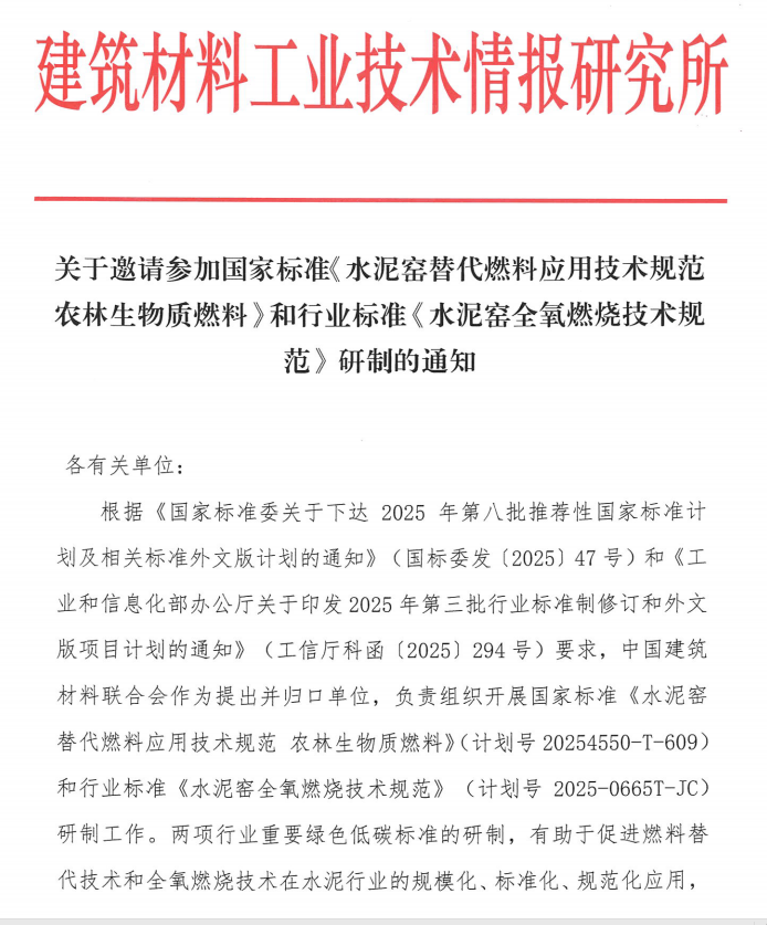 國(guó)標(biāo)《水泥窯替代燃料應(yīng)用技術(shù)規(guī)范農(nóng)林生物質(zhì)燃料》及行標(biāo)《水泥窯全氧燃燒技術(shù)規(guī)范》參編邀請(qǐng)