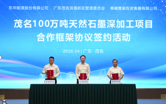 會上,廣東茂名濱海新區(qū)管理委員會、東華能源股份有限公司、華礦實業(yè)投資集團有限公司有關負責同志共同簽署《茂名100萬噸天然石墨深加工項目合作框架協議書》。