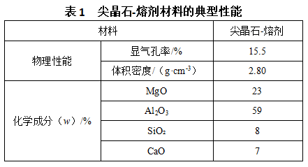 無碳材料被廣泛應(yīng)用于浸入式水口,原因是它們能在連鑄過程中抑制耐火材料內(nèi)部產(chǎn)生CO和SiO氣體,通過限制石墨溶解到鋼水中來保持工作表面光滑,起到防堵效果。品川公司選用新開發(fā)的無碳材料——尖晶石-熔劑材料,作為浸入式水口內(nèi)腔材料,選擇尖晶石是因為方坯鋼通常要經(jīng)過鈣處理,而堿性材料對這類鋼的抗侵蝕性更好。表1顯示了所用尖晶石-熔劑材料的典型性能。
