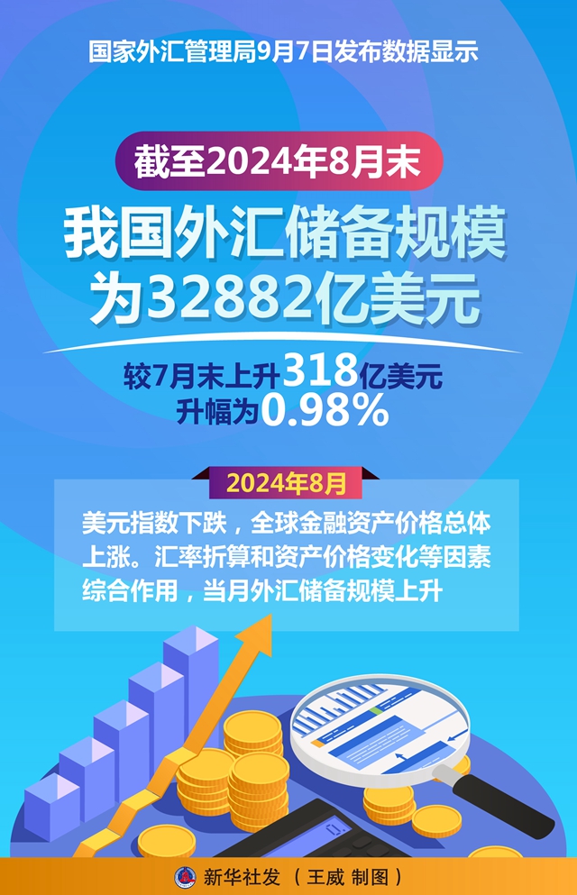 國家外匯管理局統(tǒng)計數(shù)據顯示:截至8月末,我國外匯儲備規(guī)模為32882億美元,較7月末上升318億美元,升幅為0.98%。8月,受主要經濟體宏觀數(shù)據和貨幣政策預期等因素影響,美元指數(shù)下跌,全球金融資產價格總體上漲。匯率折算和資產價格變化等因素綜合作用,當月外匯儲備規(guī)模上升。