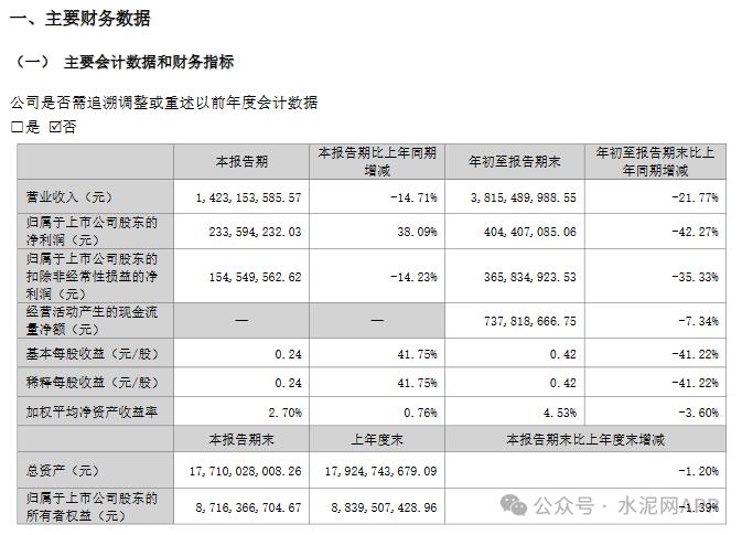 上峰水泥三季報(bào)顯示,公司前三季度累計(jì)實(shí)現(xiàn)營(yíng)收38.15億元,同比下降21.77%;實(shí)現(xiàn)歸屬于上市公司股東的凈利潤(rùn)4.04億元,同比下降42.27%。