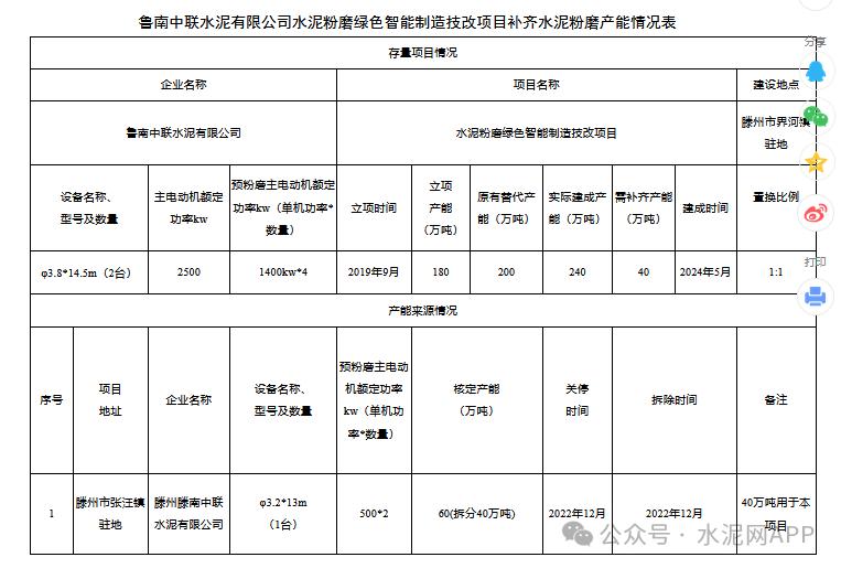 根據(jù)公示,魯南中聯(lián)水泥有限公司水泥粉磨綠色智能制造技改項目于2024年5月建成,需補齊產(chǎn)能40萬噸,置換比例1:1。