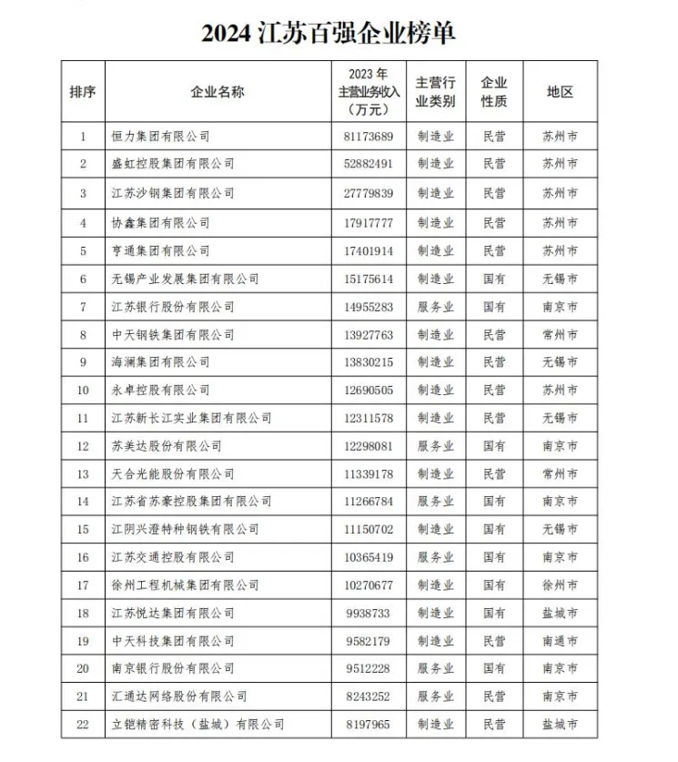 近日,江蘇省企業(yè)聯(lián)合會發(fā)布2024江蘇營業(yè)收入百強(qiáng)企業(yè)榜單。據(jù)了解,2023年,江蘇百強(qiáng)企業(yè)實(shí)現(xiàn)營業(yè)收入72861.16億元,平均每家入榜企業(yè)營業(yè)收入規(guī)模達(dá)到728.61億元。其中,恒力集團(tuán)有限公司、盛虹控股集團(tuán)有限公司和江蘇沙鋼集團(tuán)有限公司,位列2024江蘇營業(yè)收入百強(qiáng)企業(yè)榜的前三強(qiáng)。